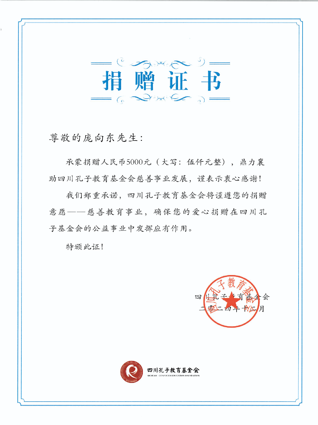 2024年12月庞总以个人身份向 “四川孔子教育基金会”捐款